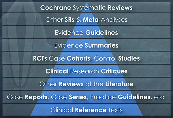 When comparing therapies, one should first review the hierarchy of evidence in which findings from systematic reviews and meta-analyses weigh more heavily than those of case reports (Figure 2). When the goal is to increase KT, what evidence is available for the selection of biomaterial alternatives to harvest grafts? Many case reports and case series are available, but to the author’s knowledge, only one systematic review2 has been published. In 2009 Thoma et al2 evaluated studies of allogeneic dermal matrices (ADMs), living cell constructs (LCCs), and other alternative biomaterials compared against autogenous tissue grafts, ie, free gingival grafts (FGGs). The authors found that the variables contributing to success were biomaterial selection, patient characteristics, and surgical techniques. Patient factors were local plaque and tissue biotype, compliance, preference, and expectations. Patient systemic health, including medication use and smoking status, was also an issue. Overall, the “gold standard” therapy for KT generation was autogenous tissue (AT) combined with an apically positioned flap (FGG+APF), which, compared with alternative therapies, significantly improved KT and AT clinical outcomes.