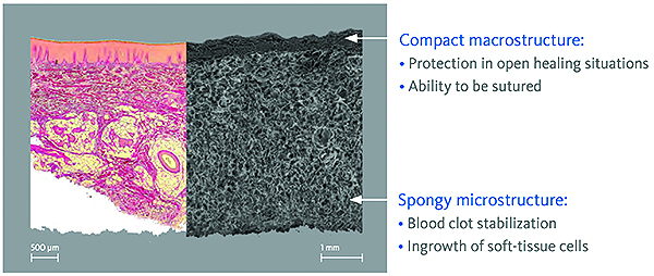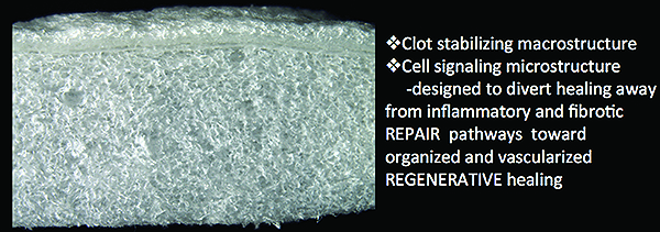 The investigators studied a xenogeneic collagen matrix (XCM) (Mucograft®, Geistlich Pharma, www.geistlich-na.com) (Figure 3), which is composed of porcine type I and III collagen. The outer layer of XCM contains compact collagen and is designed for tissue adherence and wound protection. The inner matrix layer is a clot-stabilizing macrostructure with a cell-signaling microstructure. Animal studies have shown rapid and organized healing with early vascularization (2 weeks).5,6 Historical collagen research suggests that the combination of intact and fragmented collagen fibrils found in XCM-activated endothelial progenitor cells for angiogenesis and mesenchymal stem cells with anti-inflammatory properties to divert healing away from inflammatory and fibrotic repair toward a more organized, vascularized, and regenerative healing (Figure 4).7-9